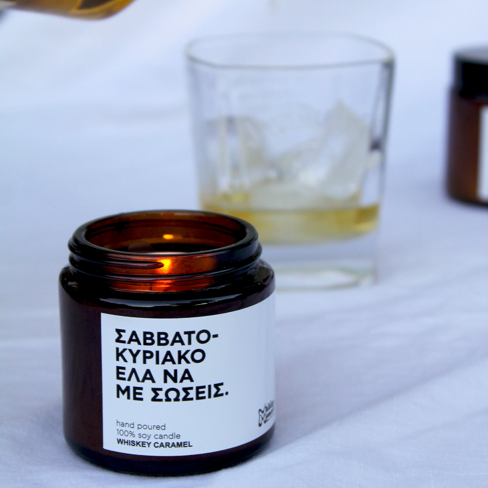 «Σαββατοκύριακο, έλα να με σώσεις» – Το κερί για τις βραδιές που ζητάς βοήθεια από το Σαββατοκύριακο. Σε άρωμα whiskey caramel, για να γλυκαίνεις την αναμονή.